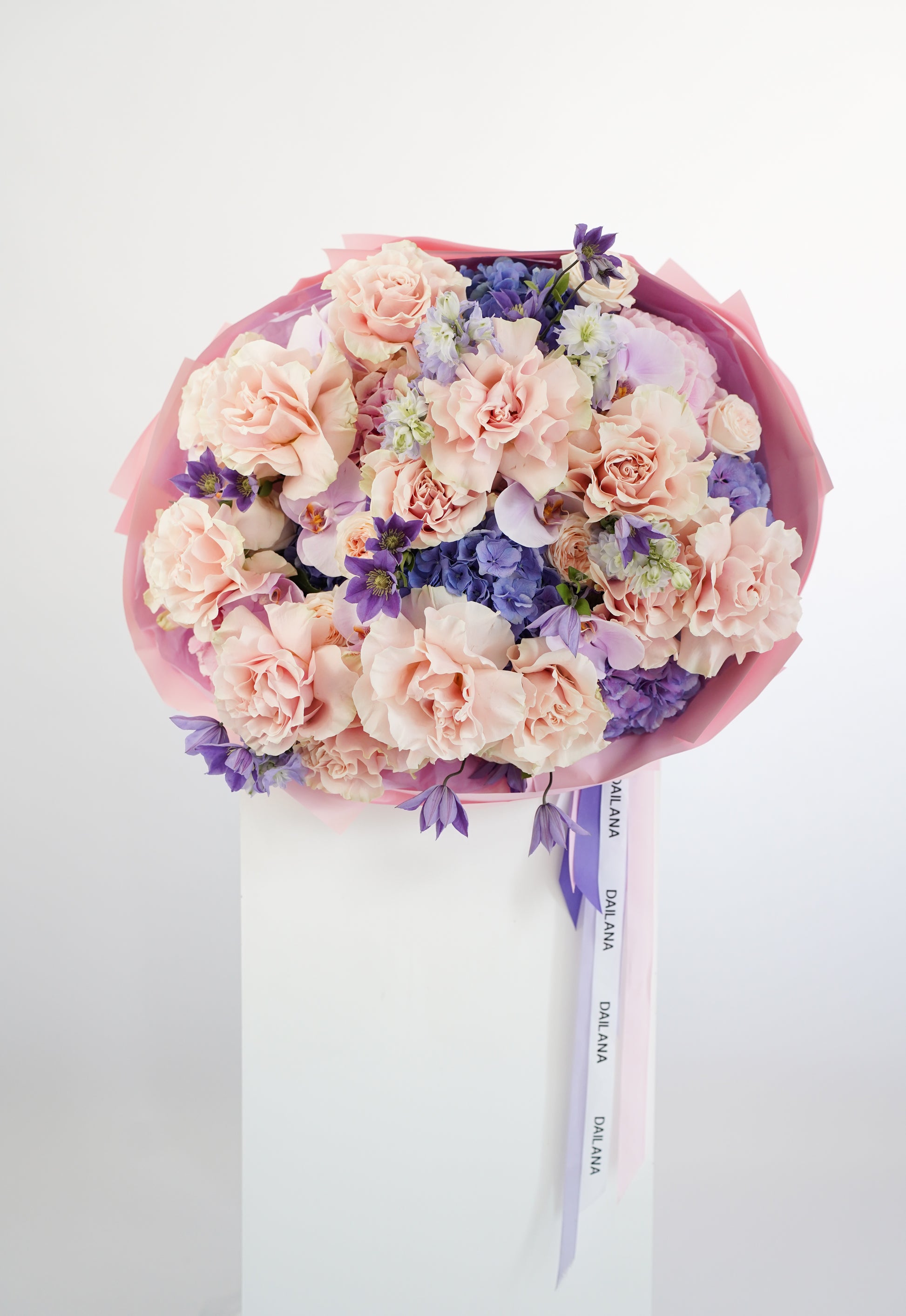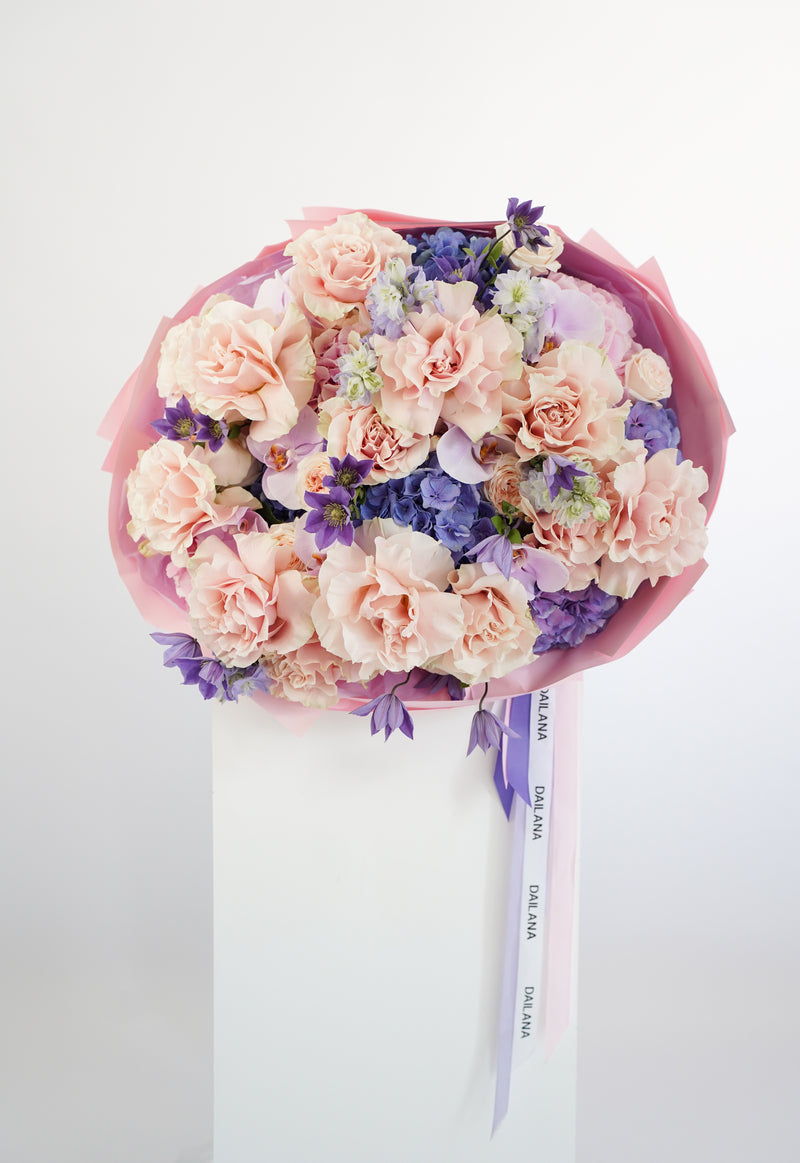 Bouquet consisting of roses, hydrangeas, orchids, clematis, delphinium.