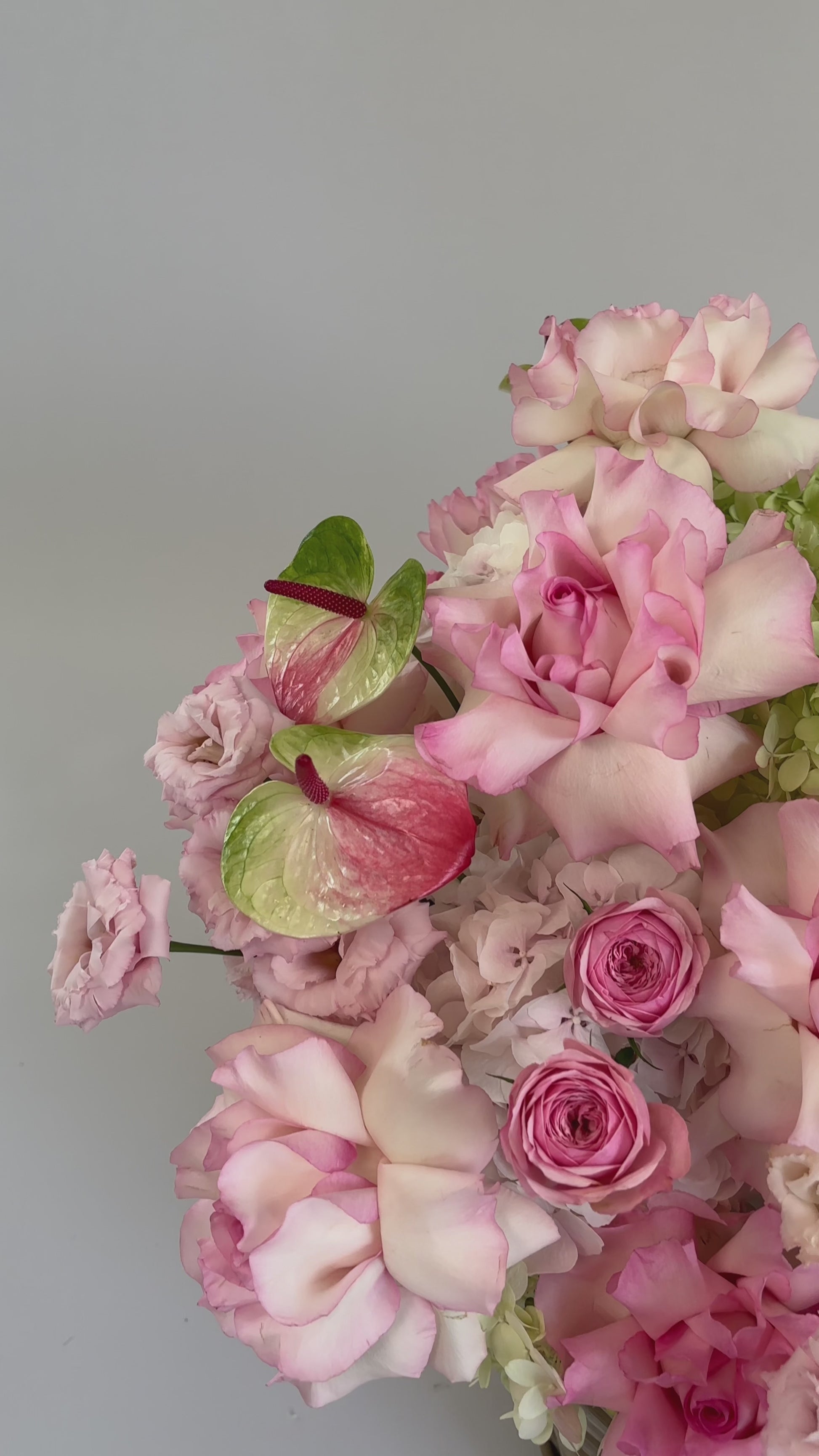 Flower arrangement consisting of mixed roses, anthurium, hydrangeas, orchids, matthiola, lissi & spray roses.