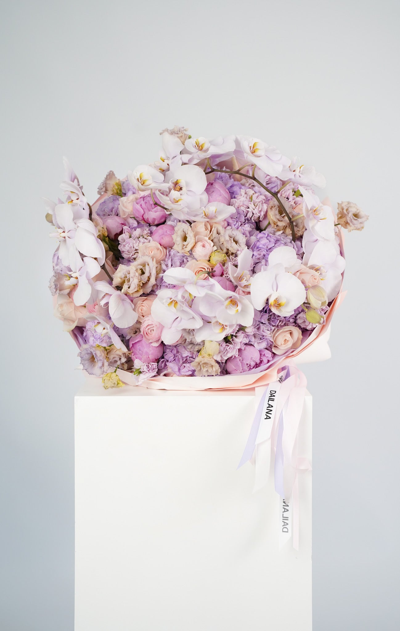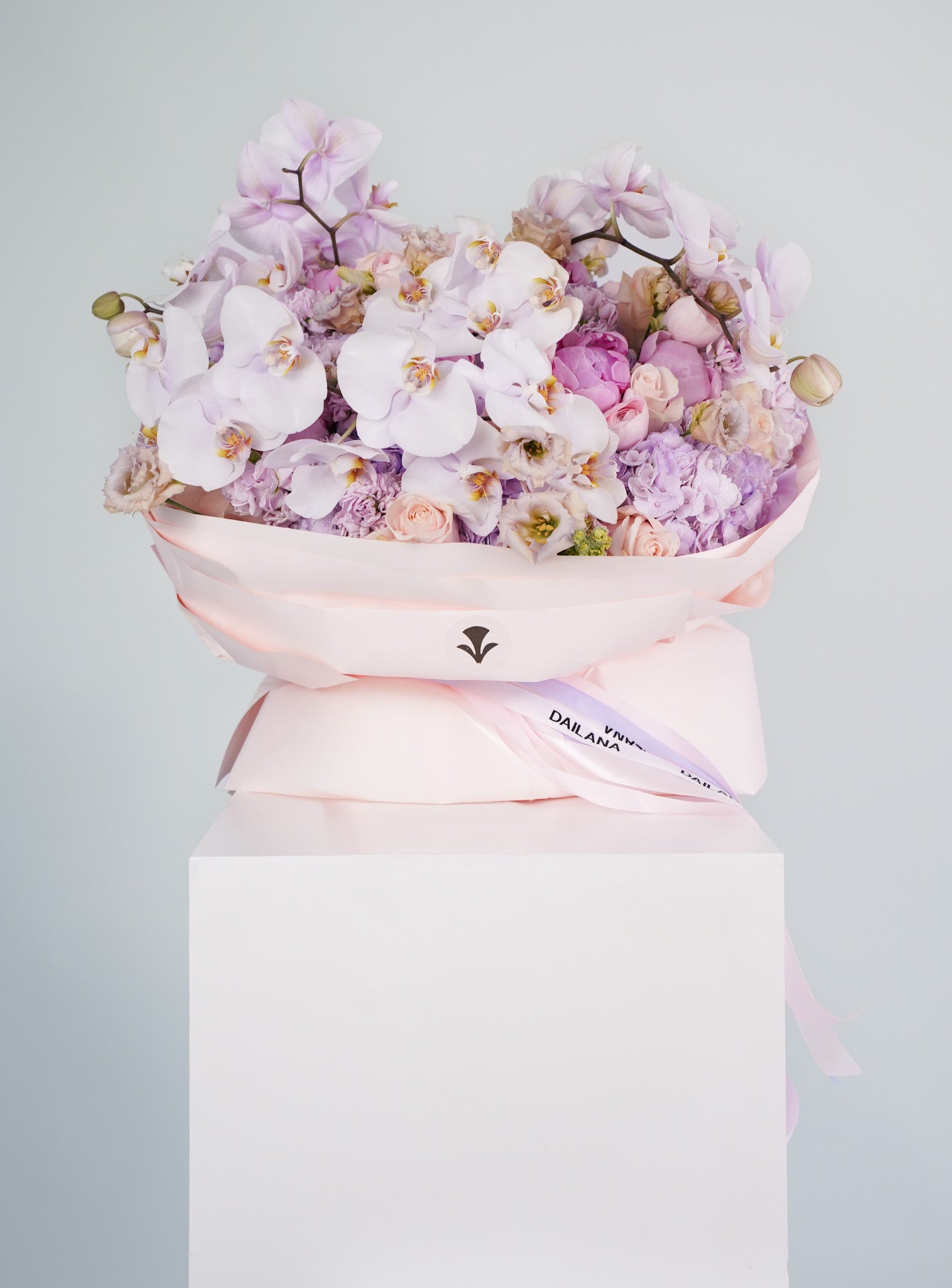 Mixed roses, hydrangeas, lissi, orchid, peonies, matthiola & spray roses. There might be flower substitutions depending on a season.