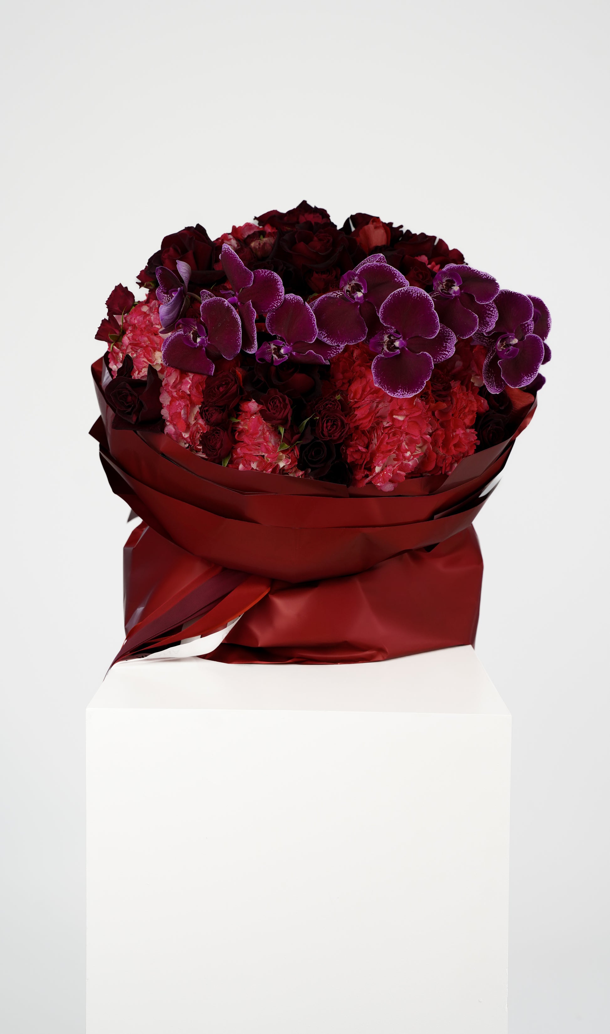 Flower bouquet consisting of mixed roses, hydrangeas, orchid, lissi.